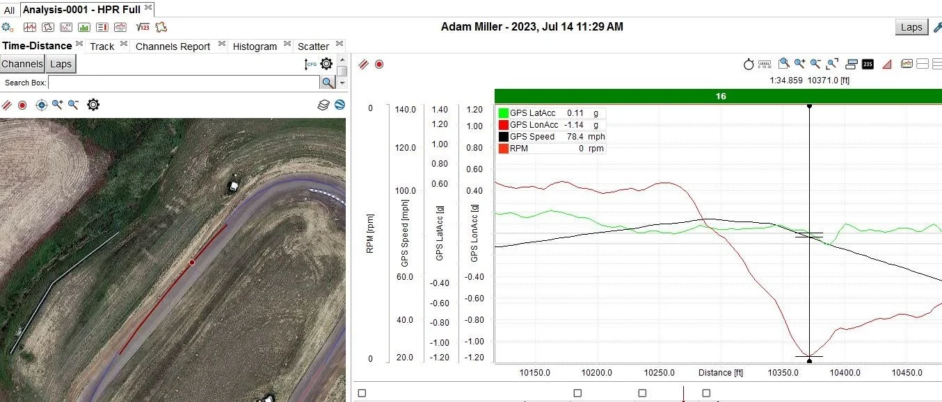 On Friday practice I found my feet much more quickly than the previous trackday. I was starting to trust the bike and the tires more and speed was coming more easily. Without the concern of simply finding a good sensation with the bike, I felt it appropriate to start logging data a little earlier in the day. Telemetry revealed that I was doing everything I could with the brakes, but wasn’t really close to the types of forces I typically generate. As a consequence, I was compromising how I like to enter corners which added up to a bad flow and pretty slow laptimes. Knowing that Rick was a slightly heavier rider with a similar style, I tweaked the front end of the bike a bit to allow that heavy braking style we both employ. I immediately dropped 2-3 seconds off my laptimes and was starting to feel better.
